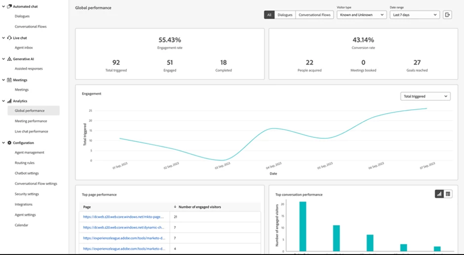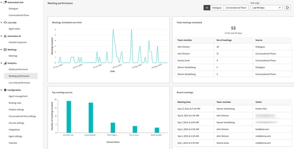 Dynamic chat analytics can be used to track and analyse a variety of metrics, including global performance and meeting performance. Global performance metrics provide insights into how your chat is performing overall while meeting performance metrics provide insights into how your chat is being used to book meetings.