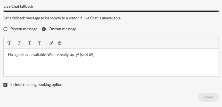 As far as I know, all you can do today is display a fallback message if the person doesn't qualify to chat with the sales agent (in the case of custom routing logic) or if sales agents are offline or unavailable. You can configure this in the Agent Management > Live Chat fallback option. When creating a custom message, you can style the font, use links, and even insert emojis! You can also select the meeting booking option in the fallback setting (see the little checkbox in the below snapshot) that would allow the visitor to book a meeting instead. I hope this helps. Please let us know if you have any questions.