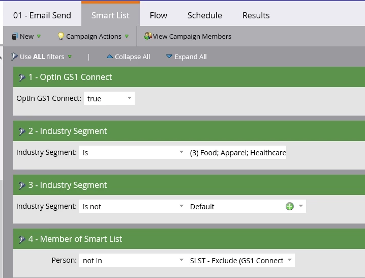 I created segments for apparel, healthcare, and food and was able to apply them to the email OK.