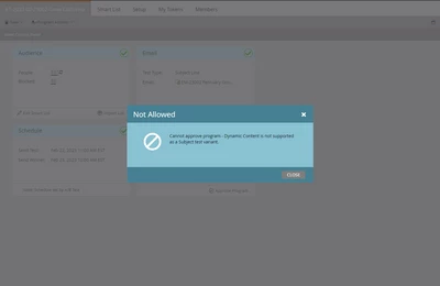 Hello I'm trying to approve an A/B test with the following token code:{{lead.LeastQuotedProduct:default=Homeowners}}, however I get the following message: