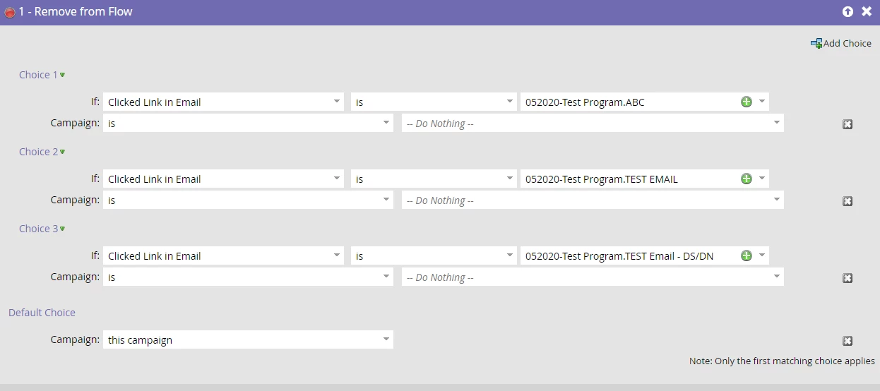 I think below flow step configuration should remove people from the campaign flow if they haven't clicked on any of the 3 emails, you can set up something similar in the Remove from List flow step too, if you would like to remove people from a list too. Also, if you would like to use email open as a condition to remove people from campaign instead of the click-email, you can switch the choice step condition from "Clicked Link in Email" to "Opened Email".