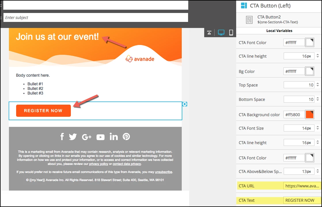 Sandy, we're using variables for all of our call-to-action buttons, for example: