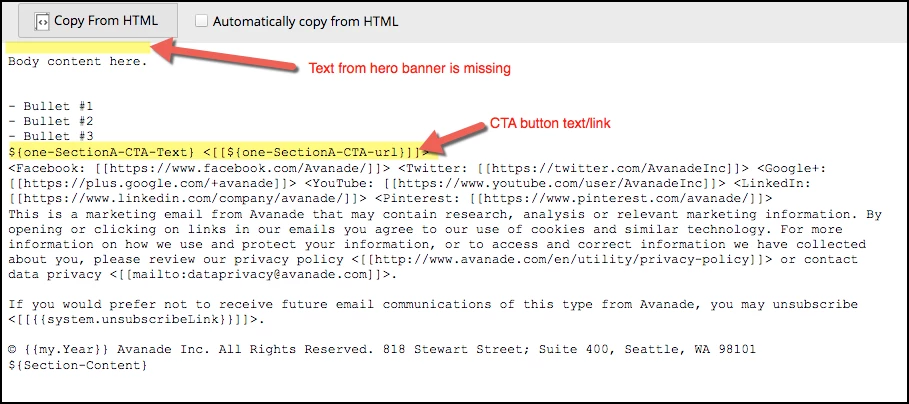 Now that we have officially deployed our new "all-in-one" template in Marketo, I'm now finally realizing what an issue this is.  The template uses variables extensively for things like editable hero banners, call-to-action buttons and URLs.  For example: