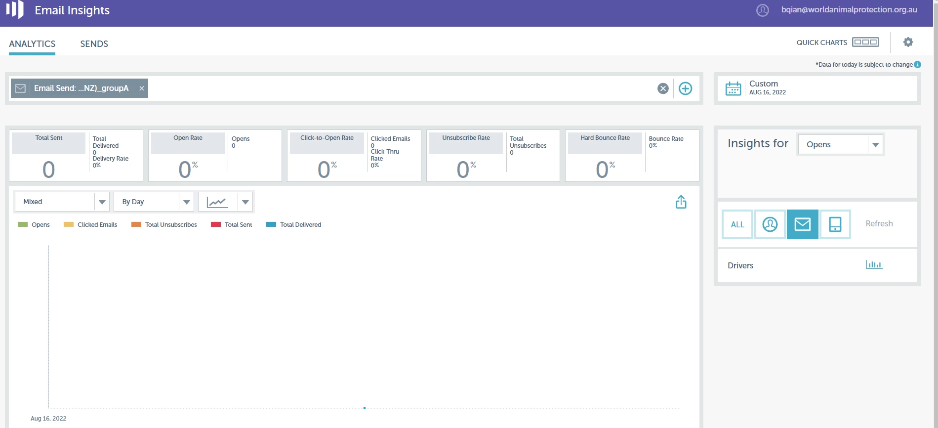 Then I tried to go to the the Analytics tap and set up the Email Insights for this email. But nothing is showing: