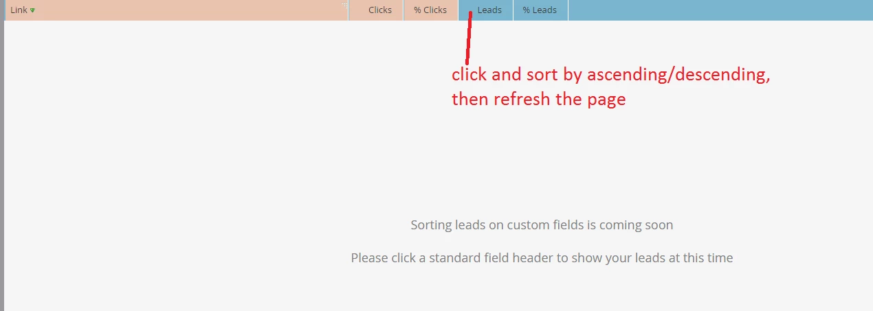 I'm having two issues here. The pressing one right now is that when I attempt to review the report, it says "Sorting leads on custom fields is coming soon. Please click a standard field header to show your leads at this time." I was unaware of selecting a new header, so I'm not sure what went wrong. In any case, I'm not able to review the report. How do I bring the report back to life?