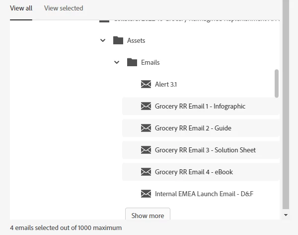 Once I've gone back through the motions of selecting the emails again, which takes so much longer than the previous method as every time I select 'show more' I'm sent back to the original long menu and have to find the campaign all over again - not a huge fan of this update. Anyhow, once all the emails are yet again selected, note there are 4 emails selected for this: