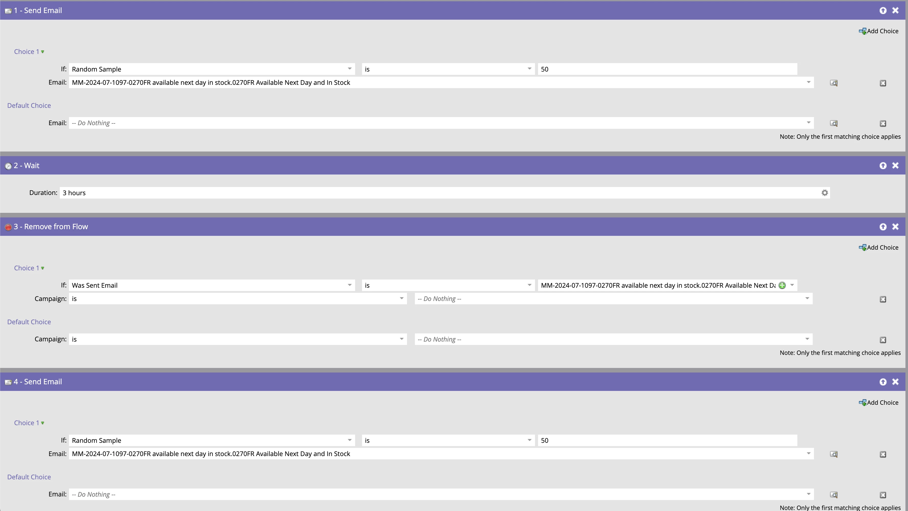 We've set up this simple flow to select 50% of our audience, send the email, wait a few hours, remove sent contacts from the flow, then send to the remaining 50%.