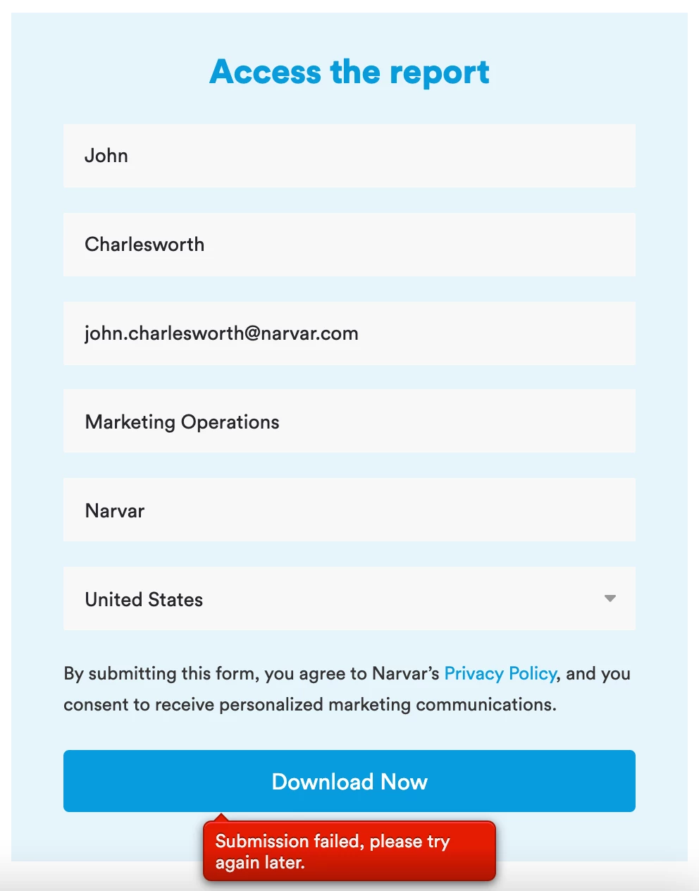We are having an issue with forms embedded on WebFlow landing pages where inconsistently, the form throws an error of "Submission failed, please try again later". This is related to other threads in the community, here and here. I've shared both threads with our developers and they don't think that we have the same issue loading forms from 2 different aliases.