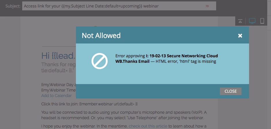 Error approving Email — HTML error, 'html' tag is missing
