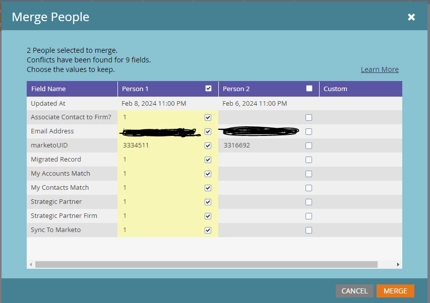 Error when trying to merge duped email address contacts - One from SFDC one from Marketo