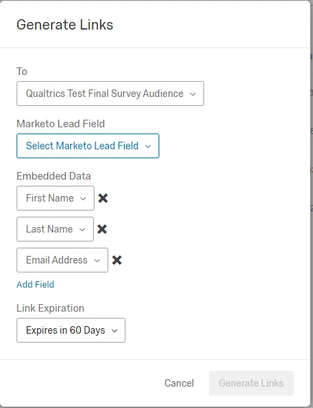 As a part of this process you can set-up personal links for your survey. This allows you to embed certain Marketo fields as Embedded Data within the personalized URL and send it behind the scenes to the Qualtrics survey. This means you no longer need to waste precious survey fields on information you already have like: