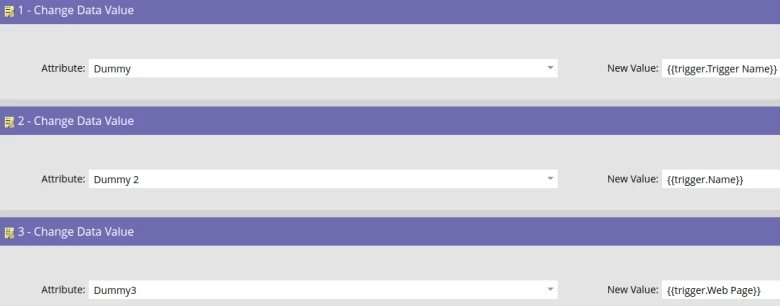 - {{trigger.Name}} is the object related to the trigger e.g. the form name for a fills out form event (see the sections below for examples) or in the case of custom activities then it is the primary attribute value of the custom activity.