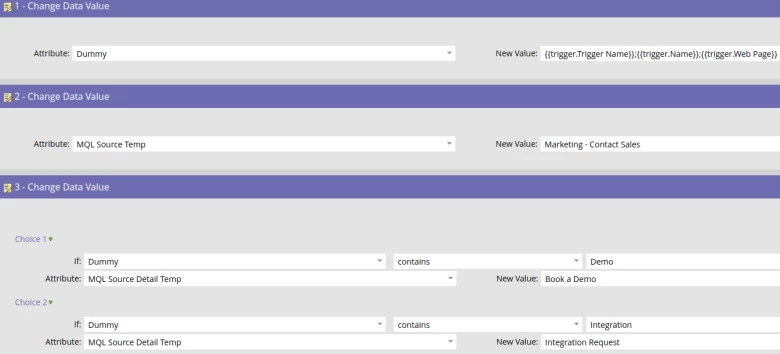 In one of our MQL campaigns we trigger on certain form fills and then use the “Dummy” field in the choices of the Change Data Value flow step to decide what value to set a person’s MQL Source Detail field to based on the form they filled out (since the form name is in the Dummy field via the {{trigger.Name}} token).