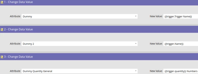 If your custom activity has more fields than the primary attribute value then you can extract these field values (and the primary attribute value too btw) using the {{trigger.field name}} trigger token where you would replace “field name” with the name of the custom activity field e.g. {{trigger.quantity}} in the example below.
