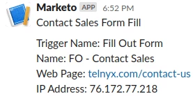 {"text": "\n\nContact Sales Form Fill\n\n Trigger Name: {{trigger.Trigger Name}}\n Name: {{trigger.Name}}\n Web Page: {{trigger.Web Page}}\n IP Address: {{trigger.Client IP Address}}" }