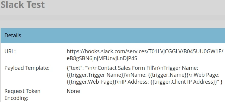 The webhook in this example sends a message to Slack containing information about the form fill that triggered the smart campaign to run.