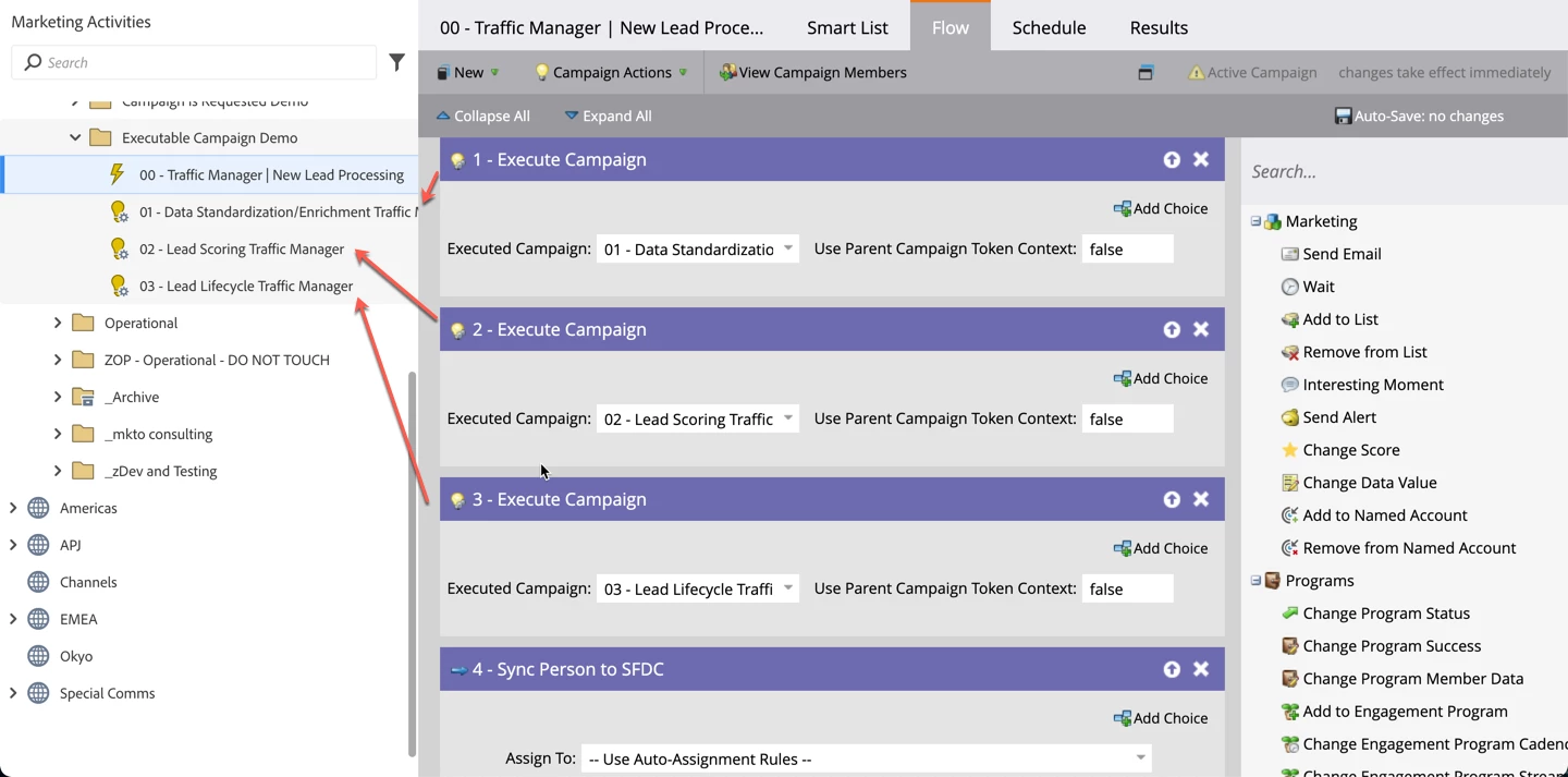 With executable campaigns, you now have the ability to force a lead to finish a process before continuing onto the next without the need for wait steps or a decentralized program. Using the same example as above, with executable campaigns you now have the ability to force a lead to complete the data standardization campaign first before requesting the lead scoring and lead lifecycle campaigns. This provides you the ability to wait until all processes are completed before syncing to SFDC. The largest benefit of using executable campaigns is the ability to force a flow to finish, ensuring the data has been successfully updated. This provides you the benefit of keeping one master traffic manager campaign with the execute campaign where you can easily troubleshoot, plus a clean activity log on the lead where you can easily trace back any issues directly to a campaign. Additionally, since tokens can be sent from the parent campaign, you will have the ability to pass token information (like trigger.name or my.program name as an example) into the executable campaign to then use in change data flows.