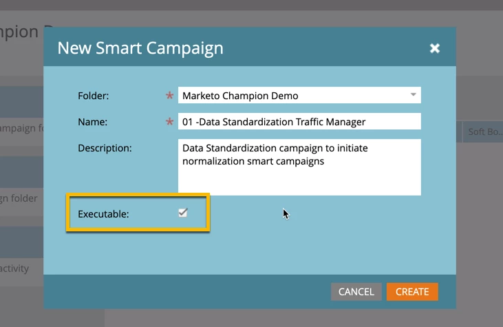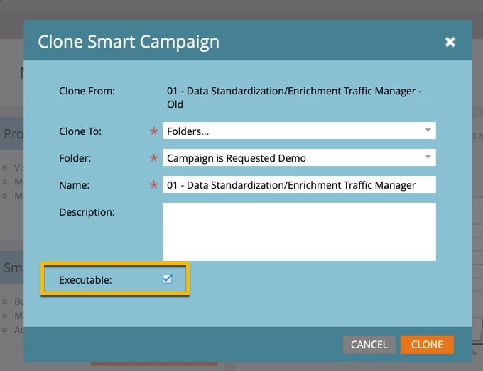 When cloning a smart campaign and making it an executable campaign, you can clone an existing smart campaign (doesn’t have to be an executable campaign) and make it an executable campaign by checking the “Executable” checkbox on the “New Smart Campaign” pop-up. This will create a new executable campaign!