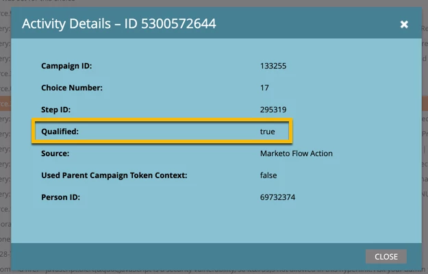 When troubleshooting or investigating how the campaign ran, you will now be able to see whether or not a lead that had an executable campaign requested successfully ran through it or not. In the activity detail on the lead (double click from lead details), you will see a “Qualified” row and a true/false option. If the lead requested an executable campaign but there were additional filters in the executable campaign smart list that the lead did not qualify for, the “Qualified” value will be false and the lead will continue to the next flow step in the executing campaign.