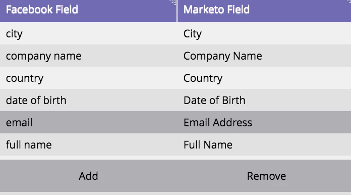 Marketo's mapped fields - FB Support noted double-mapping could cause problems, so I unmapped "Full Name" when testing "First Name" and "Last Name", and I also tried mapping the converse (Full Name mapped, First+Last unmapped).