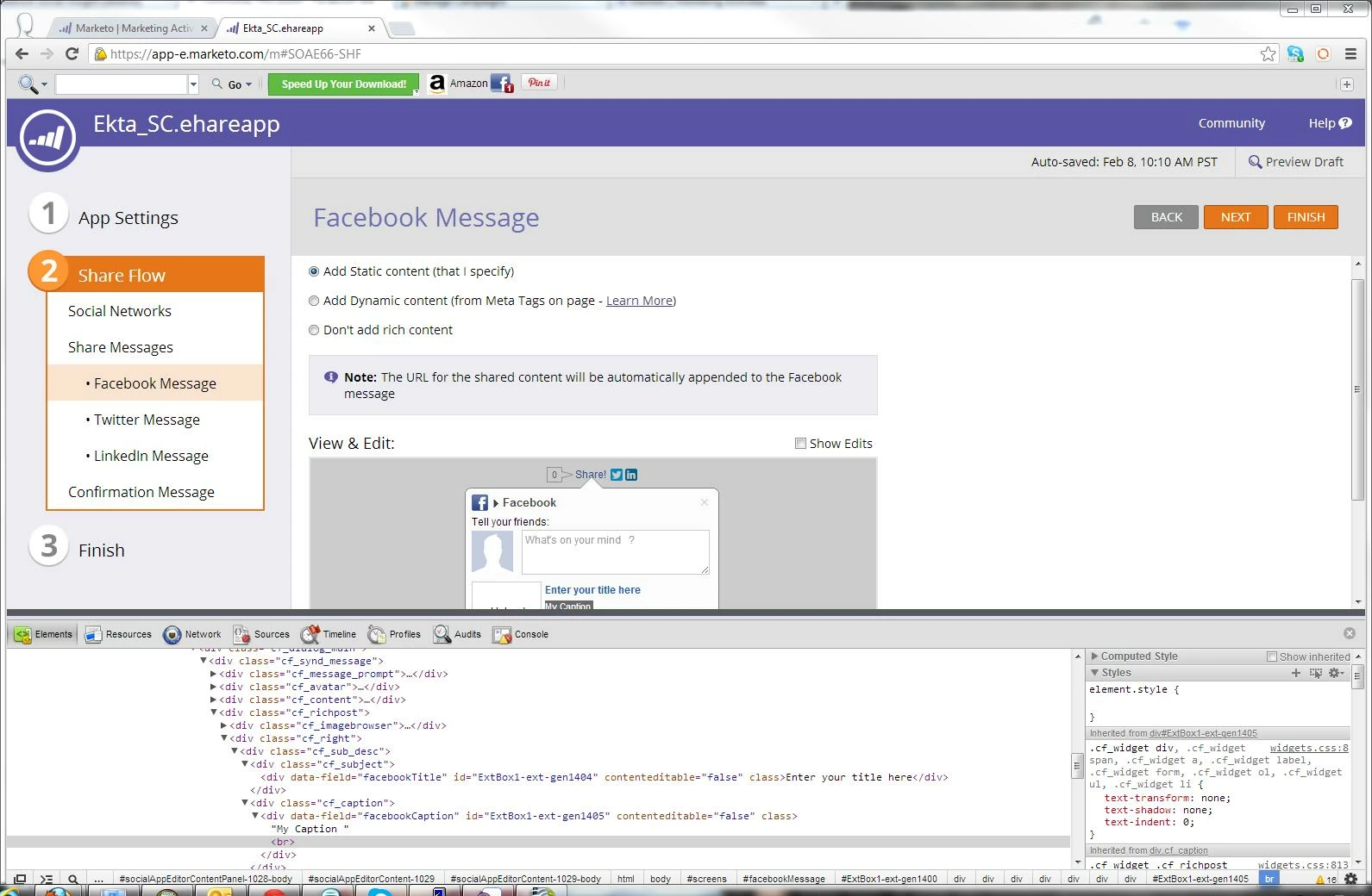 Have just been able to start playing with the new Social Buttons tonight... I think I've got it all sorted out however: when I use the "Add static content (that I specify)" option, save it, place the button on a test landing page, and click on the FB button, everything looks decent except for the blue title (see below)... obviously the coding is appearing, along with the title itself.
