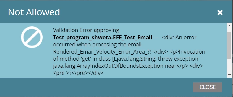 Validation Error approving Test_program_shweta.EFE_Test_Email — <div>An error occurred when procesing the email Rendered_Email_Velocity_Error_Area_?! </div> <p>Invocation of method 'get' in class [Ljava.lang.String; threw exception java.lang.ArrayIndexOutOfBoundsException near</p> <div><pre >?</pre></div>