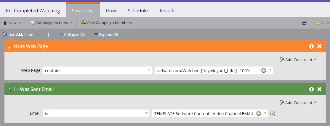 I am able to get the page and the video to render/play, but in the cases where I've inserted the token for the video URL into the Smart Campaign trigger (screenshot below) the trigger is not firing even though the URL from Vidyard matches the title I provided in the {{my.vidyard_title}} token in my program.