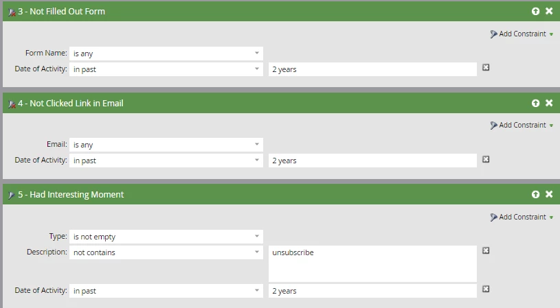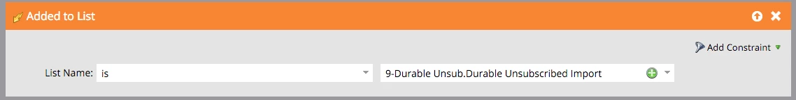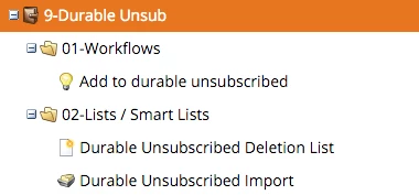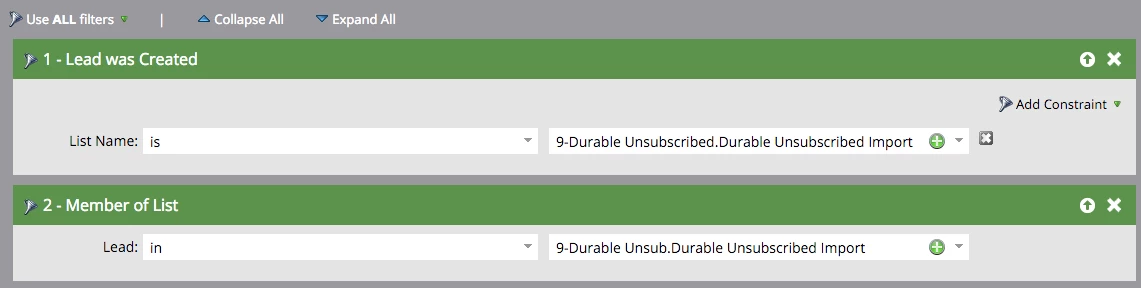 - The "Durable Unsubscribed Deletion List" will contain all the leads that are unsubscribed but should not be kept in the database. In other words, they were added to Marketo when you imported leads to the Durable Unsubscribe Import list. It's filters are set as is :
