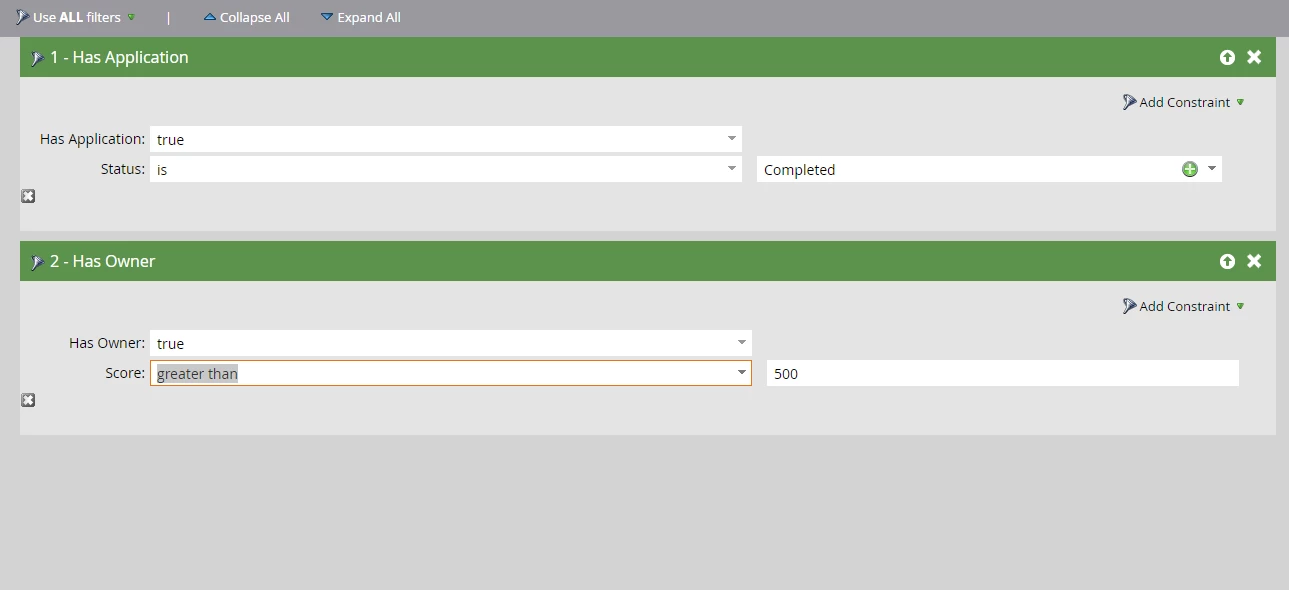 Nonetheless, a challenge arises with our current approach when attempting to filter leads based on specific criteria. For instance, we want to filter leads who have applications with a "completed" status (application.status = "Completed"), and the corresponding application owners should have a score greater than 500 (owner.score > 500). We created a filter in this manner =>