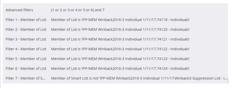 I want to suppress a group of email addresses (which could be on any one of the 6 lists) - so the suppressions will not pull into the mailing (based on the individual/master lists). I’ve set it up as follows – list/filter 7 being the list I want to suppress (see attached screen shot)