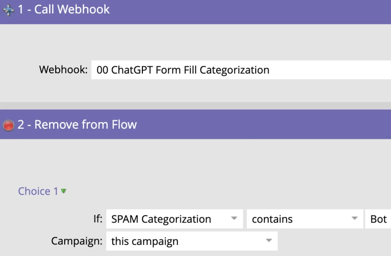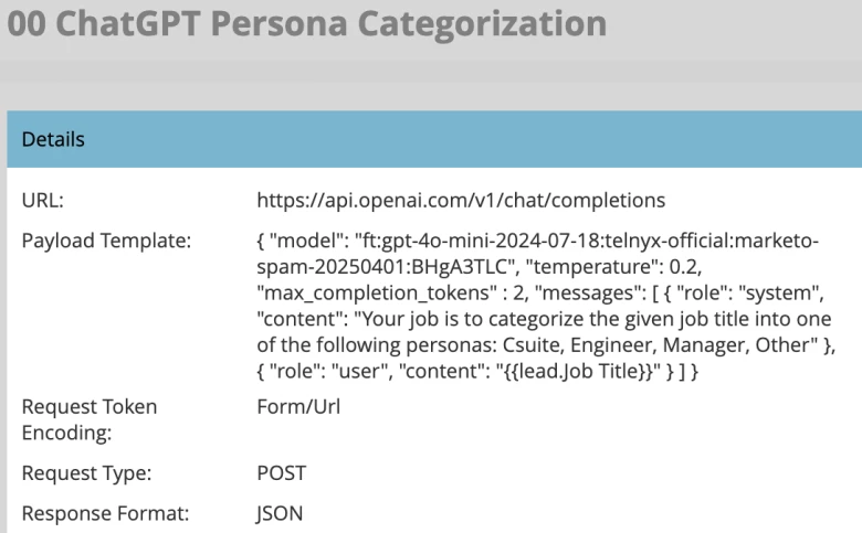 In steps Open AI’s Fine tuning feature which allows you to train one of OpenAI’s models on your own form fill data. Now when you call a webhook from Marketo to reference this fine-tuned model and the result comes back as bot/SPAM then you can remove this lead from the flow of your smart campaign so they do not waste processing and they do not end up in front of your sales team.