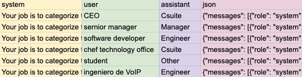 The OpenAI fine tuning feature then requires the training data to be in a JSONL file which is a file where each line is in JSON format containing the system, user, and assistant values. You can see what this looks like for each of the 3 use cases above in this Google sheet in the “…Export JSONL” tabs.