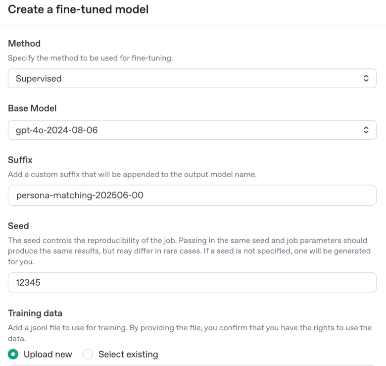 - Write the “Suffix” that will appear at the end of the fine tuned model id to help you with identifying this model in the future e.g. “persona-202050523-00”