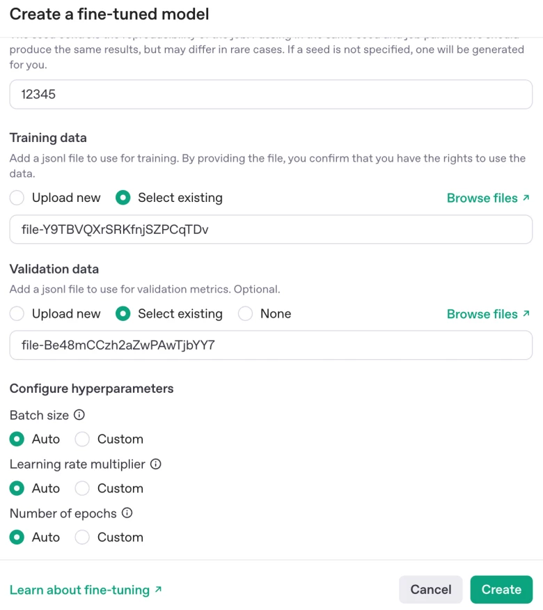 - Leaving the “Batch size”, “Learning rate multiplier”, and “Number of epochs” as “Auto”