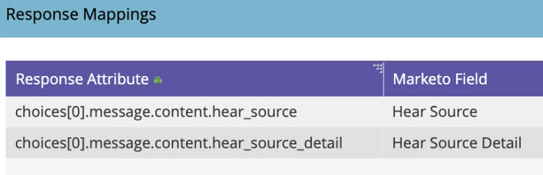 A typical response from the Chat endpoint is pasted below. In order for us to get the answer from the model we have to dig down to the content parameter using this notation in Marketo: choices[0].message.content. We then map this answer to our desired Marketo field so that we can use it in our smart campaigns or our data analysis.