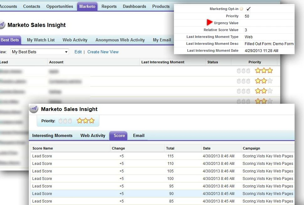 Lead scoring is still occurring. But the “Urgency Value” field from Marketo to Salesforce is also now empty across old and hot new leads. Again, all Flames are also gone – empty.