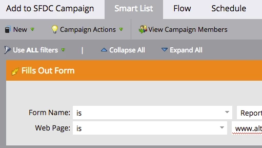 I wonder if you should change the Web page url to  say contains instead of is www.alt. I'm seeing a red squiggly error on that field.