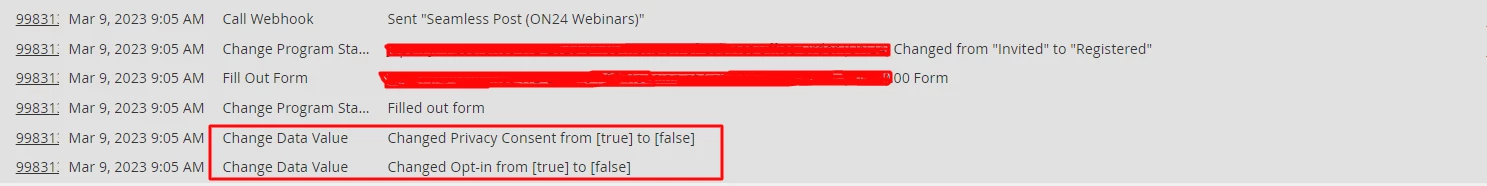 I have set all fields as mandatory in a form using custom JavaScript in Marketo. However, I have noticed that only three leads had their values changed in the database, despite submitting the form with all required fields completed. Upon reviewing the screenshot, I noticed that some activities were changed while submitting the form. I am unsure how the values for these individuals were stored as empty.