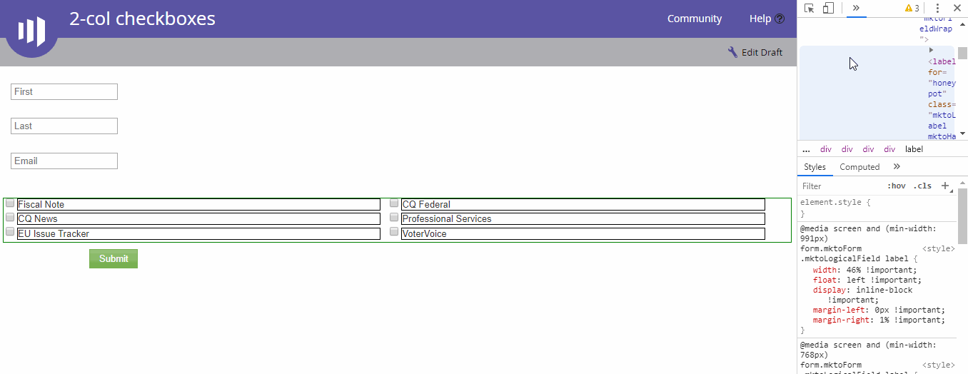 I am working on a form from Marketo on my actual site and the form consists of text fields followed by some check-boxes, is there a way to make these side by side?? Including an attachment. I cannot include the link because it's in a development area that cant be accessed anywhere but in our office but I'm using form 4 or 7 if that helps. No other edits have been made aside from cosmetically.