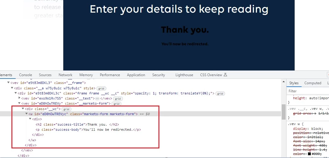 We have external developers creating a microsite for us but for some reason the Marketo forms we've created for them are not redirecting to the ungated version of the site and instead just display a thank you message, even though the form is set to redirect.