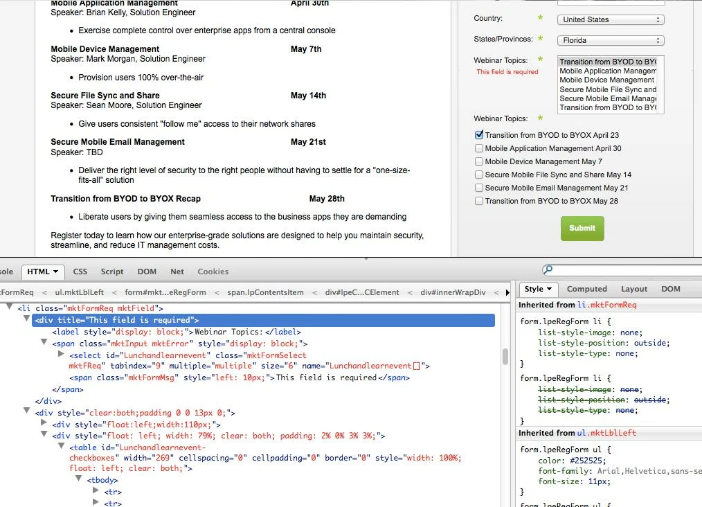 @ Eric Hollebone: I've used the documentation you created here to create a multi select check box: http://test.hollebone.ca/marketo-form-convert-multi-picklist-to-checkboxes-with-jquery/, however, I am not able to submit the form. Any ideas what's wrong? Here's the link to the page: http://go.appsense.com/MarciaTest_webinarpage1.html.