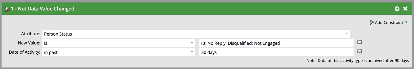 When using the inactivity filters, I'm wondering how the logic applies to the constraints that you can add. For example, I want to exclude people that have had their Lead Status changed to 1 of 3 values in the past 30 days. I don't care what the current value for Lead Status is, only what happened in the past 30 days (meaning, if the status has since been changed to another status, I still want these people in my smart list). I want to know if I should include "New Value IS X,YZ" or if it should be "New Value IS NOT X,Y,Z"