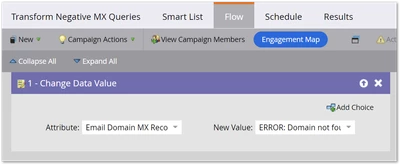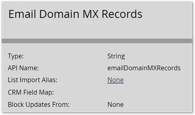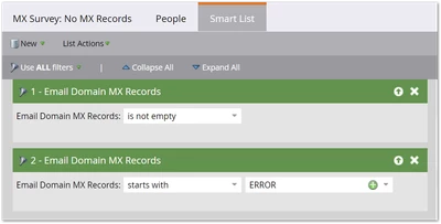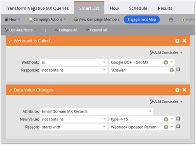 A few different DNS responses amount to “no MX record.” For example, if a domain has no nameservers at all, they implicitly have no MX records, though the response details are different. I use this Smart Campaign to normalize any response that doesn’t contain Type 15 records to the value ERROR: Domain not found in DNS or no MX record: