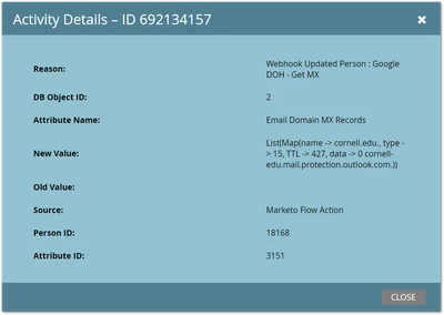 [3] DoH uses the binary DNS wire protocol, not JSON (i.e. the response is a binary stream, like when you download an image). So technically, you’re not sending a DoH request from Marketo; rather, Google is using DoH and transforming the response to be webhook-compatible.