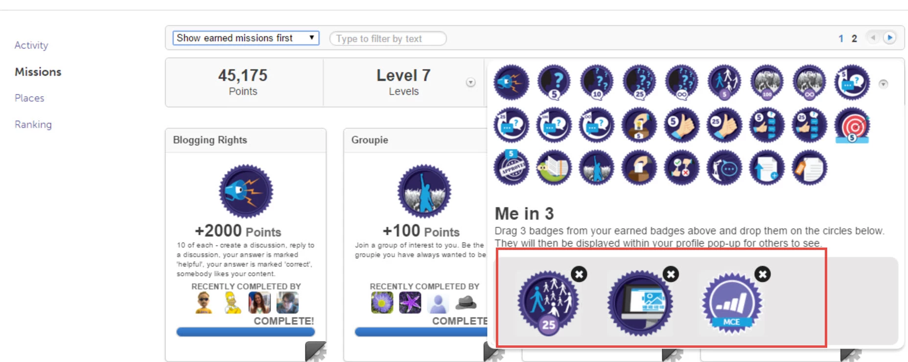Here you will find a complete overview of your level, points, and you can drill down on the missions and rewards you have completed or need to complete. After clicking Missions, you can not only sort your view but this is where you control your "Me in Three", or 3 badges of your choice to shwocase prominently. These 3 follow you around as you post letting anyone who hovers over your name know you have those skills. As you can see, I have chosen the influencer, blogger, and of course MCE rewards (the names of the badges show up on hover).