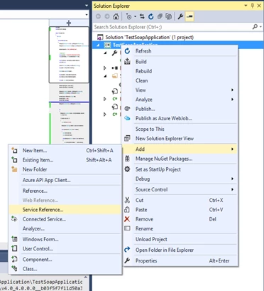 - In the Solution explorer right click on your project/solution and choose “Service Reference”