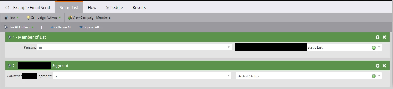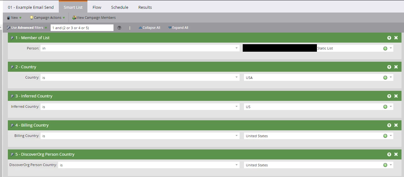 If I was sending an email to a US-only audience, here is what my smart list looked like before we created this segment: