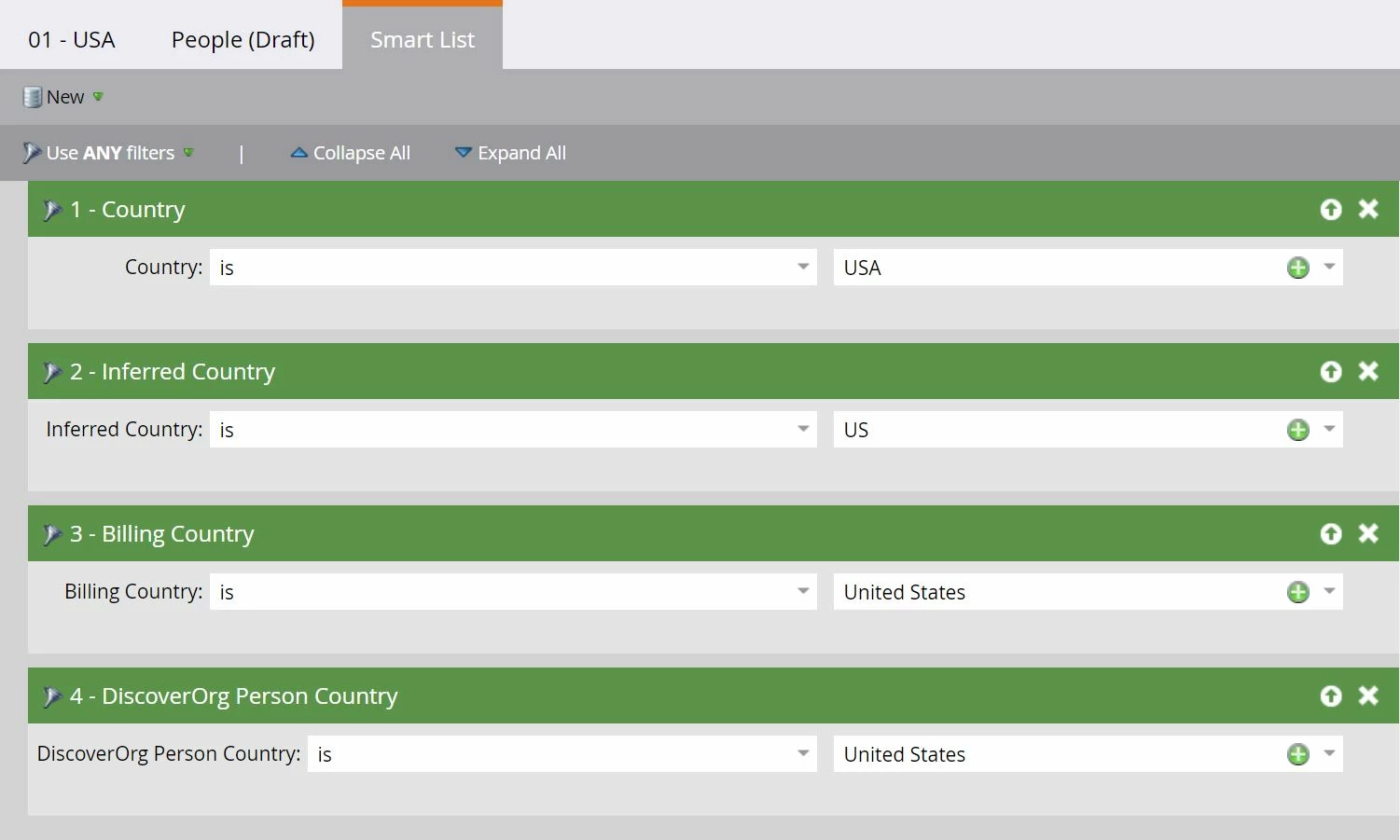 The next time you are building a smart list to send an email to an audience in a specific country, you can use just one filter – the Countries segmentation – instead of having to remember all the fields that might contain that information, dragging all of them over, and then setting up the filter logic.