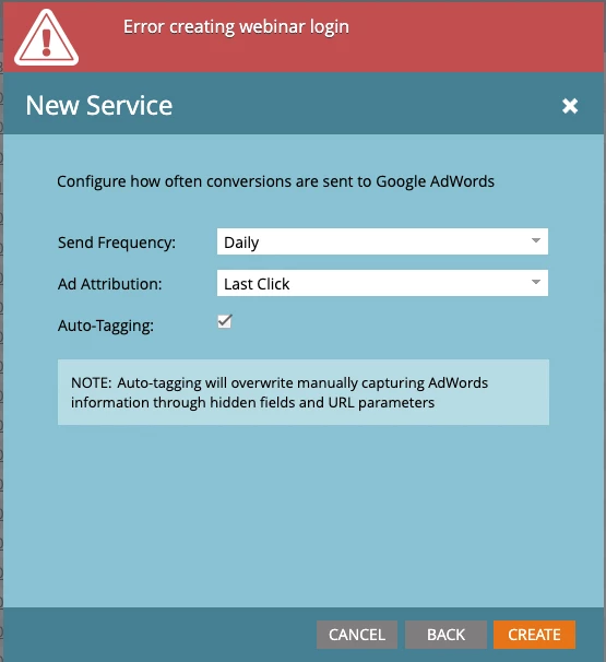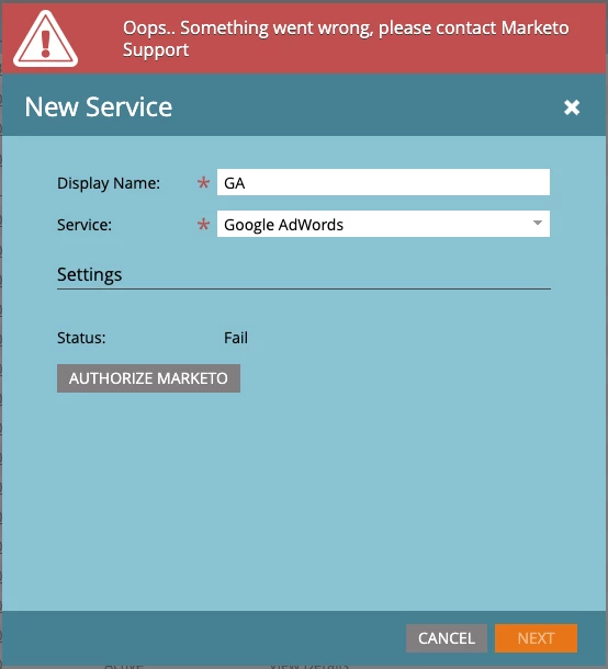 I am having trouble integrating Marketo Google Adwords Service Action with Google Ads. When trying to 'Authorize Marketo' while setting up the Service Action, I get an error message saying "oops... something went wrong, please contact Marketo Support". I am also getting another weird error message stating "Error creating webinar login" when creating the Service Action.