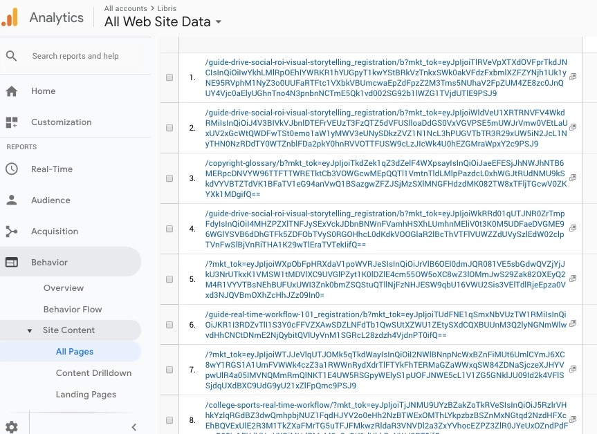 Even though I have added mkt_tok to the Exclude URL Query Parameters list in Google Analytics, the Marketo Token still passes on, making it look like 1 page is actually hundreds (see screenshots).